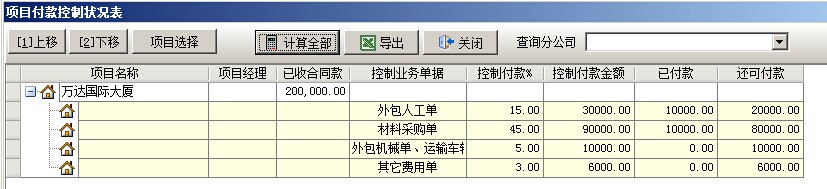 2. 假設(shè)【萬(wàn)達(dá)國(guó)際大廈】項(xiàng)目,承包合同中累計(jì)收款金額為20萬(wàn),那么按控制比例得出的結(jié)果是:人工費(fèi)=200000*15%=30000、材料費(fèi)=2000000*45%=90000、外包機(jī)械運(yùn)輸車輛=10000、其他費(fèi)=6000,具體資金狀況我們可以在菜單二次開發(fā)中打開【項(xiàng)目資金控制狀況表】查看,其中包含了項(xiàng)目控制付款金額(根據(jù)上面的公式得出),已付款金額(根據(jù)累計(jì)付款單得出),還可付款(根據(jù)上面兩組數(shù)據(jù)得出)。