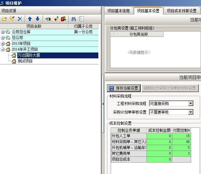 1. 以項(xiàng)目【萬(wàn)達(dá)國(guó)際大廈】為例,首先要給項(xiàng)目設(shè)定一個(gè)控制比例,在工程管理模塊【項(xiàng)目維護(hù)】中,選擇好項(xiàng)目之后,在項(xiàng)目基本設(shè)置中設(shè)置控制比例,這里的控制比例與前面的成本控制金額無關(guān),是人工、材料、機(jī)械、其他費(fèi)在付款時(shí)所占項(xiàng)目收款的控制比例。如下圖:紅框所畫位置為付款控制比例人工費(fèi)占15%、材料費(fèi)占45%、外包機(jī)械和車輛運(yùn)輸占5%、其他費(fèi)3%