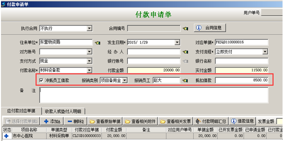 請款人去辦理相關業務之后(如:采購相應設備、支付相關運費等),是針對借款做報銷,首要根據業務類型,創建好相關業務單據(采購設備是先做采購入庫單),然后根據業務單據發起付款申請生成【付款申請單】,填寫【付款申請單】時要選擇沖抵員工借款,把之前的借款沖抵掉,這樣在員工借款單統計表中,報銷欄就會有相應的累計。