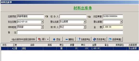 3. 【材料調(diào)撥單】主要用于:項目與項目之間的材料調(diào)撥,或公司總庫與項目之間的材料調(diào)撥。在填寫時要選擇好調(diào)出項目和調(diào)入項目。調(diào)出項目有兩種出場方式:庫房調(diào)出和班組繳料,調(diào)入項目有兩種進場方式:調(diào)撥入庫和直進項目。進場方式選擇直進項目時,明細中的材料金額會進入調(diào)入項目的成本中。如果調(diào)出項目,出場方式選擇的是班組繳料,也就是從項目現(xiàn)場直接調(diào)出的,這時調(diào)出項目的成本中會減去明細中材料的金額。