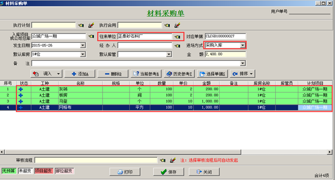 “采購計劃單”添加完成,則添加“采購入庫單”進行采購入庫,采購入庫。在添加“材料采購單”基礎信息時,選擇“采購計劃單”,并調入計劃單中的材料。如圖: