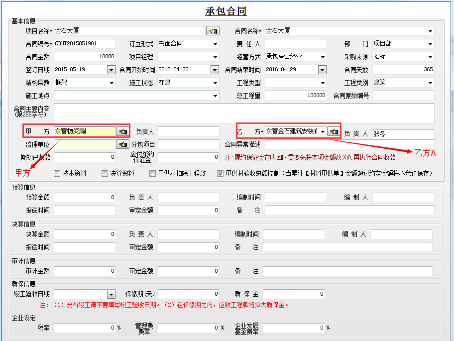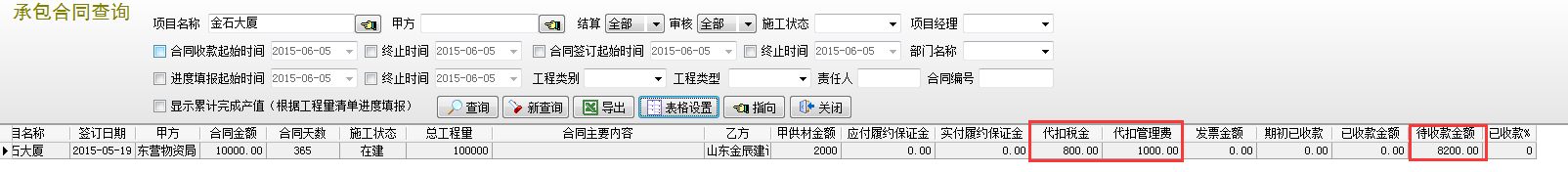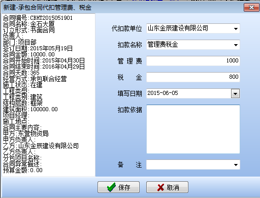 在工程項目資質(zhì)掛靠管理中因為借用乙方B的資質(zhì),需要扣除管理費(fèi),如果需要乙方B代開發(fā)票還需要扣除稅金。在承包合同中[代扣管理費(fèi)稅金]模塊下操作,如下圖: