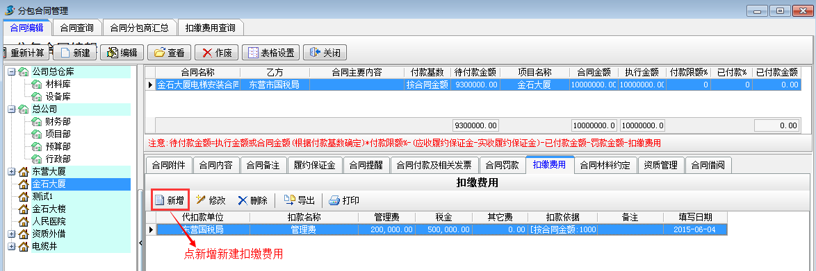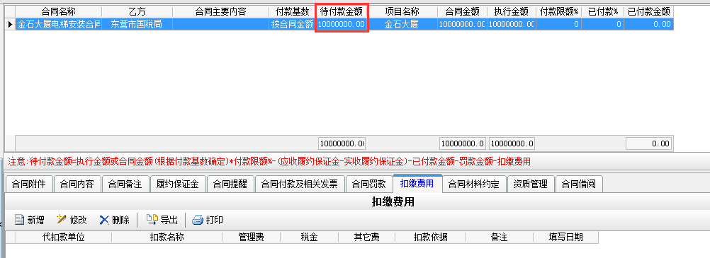 在工程項目資質(zhì)掛靠管理中乙方B借用乙方A的資質(zhì),乙方A需要扣除乙方B管理費(fèi),如果需要乙方A代開發(fā)票還需要扣除稅金。在分包合同中[扣繳費(fèi)用]模塊下操作,如下圖: