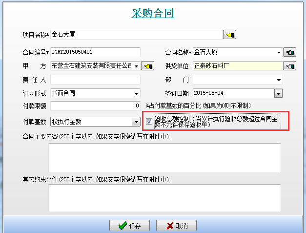 在工程項(xiàng)目管理系統(tǒng)中即通過采購(gòu)合同驗(yàn)收總額控制選項(xiàng)來(lái)控制驗(yàn)收總額。