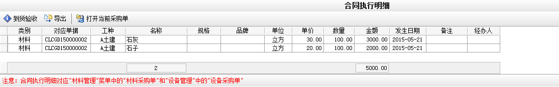 當(dāng)我們完成石子和石灰個(gè)100立方的驗(yàn)收后待付款金額則顯示驗(yàn)收金額。如下圖: