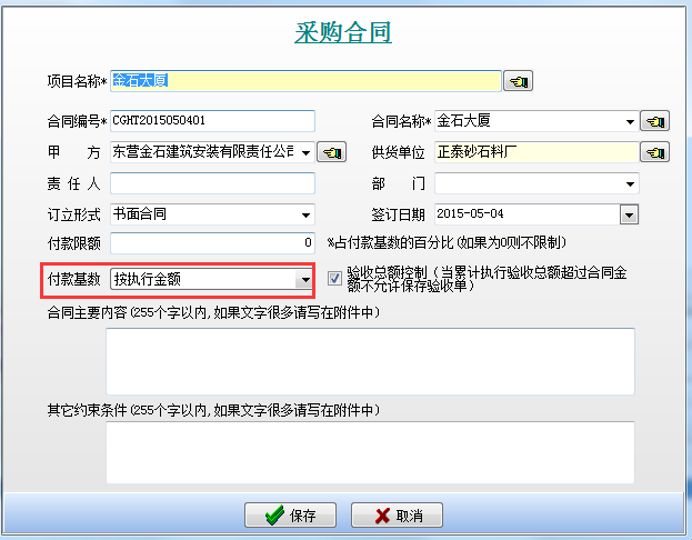即在工程項(xiàng)目管理系統(tǒng)中新建采購(gòu)合同時(shí)填寫好付款限額。如下圖: