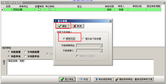 被指定的審核人,進入系統后審核單據,點擊“審核完成”或者“提交給下級處理”,直到單據狀態為“審核完成”,如圖: