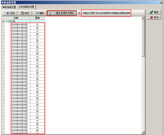 在系統中設置工作休息日,“一鍵生成周末休息日”,系統在跳轉審核時不會在休息日內跳轉,如圖:
