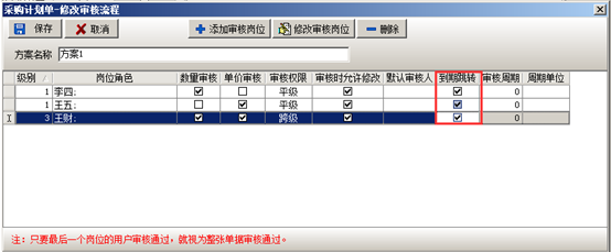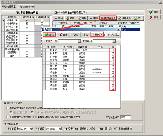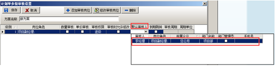 崗位角色以及用戶添加完成之后分別授權給相應的用戶(數量或者單價),或設置審核時可修改,設置完成之后點擊“保存”的按鈕,審核方案設置完成之后則授權發起人(按人名或者按崗位),在授權用戶的復選框內打勾即可,如果授權給“公共用戶”則在“公共用戶”的復選框內打鉤,被授權的用戶可在創建單據的時候選擇多級審核方案,如圖: