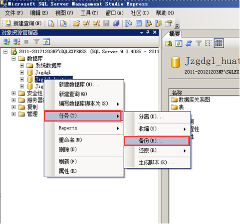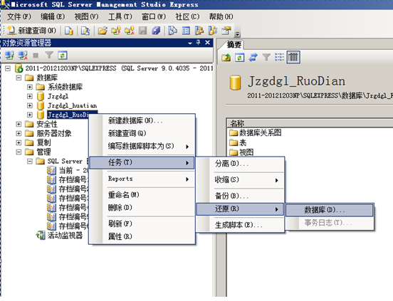 Sql2005數據還原時,在“開始”-“程序”進入資源管理器,登錄需要備份的數據庫服務器,打開企業管理器后,逐一展開,看到有數據庫項后,選中數據庫節點單擊右鍵,選擇“任務”-“還原”-“數據庫”,如圖: