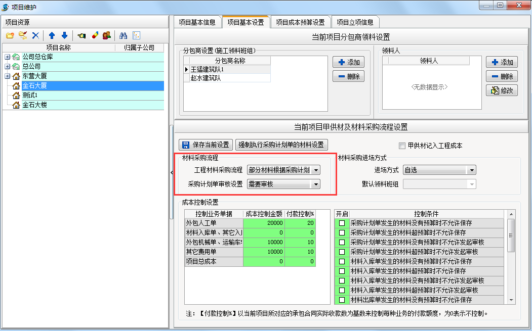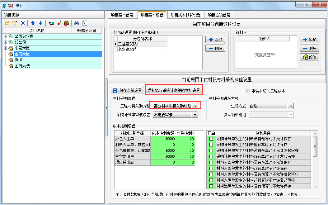 注:要讓材料采購的流程先走【采購計劃單】,必須要在【項目維護】->【項目基本設(shè)置】->【材料采購流程】設(shè)置為(1、根據(jù)采購計劃單。2:部分材料根據(jù)采購計劃)。