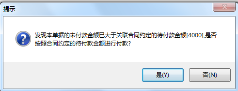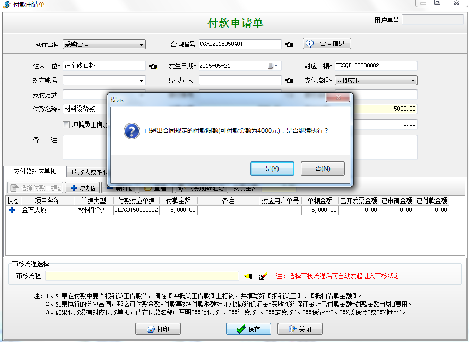 當我們選擇是時,生成付款為4000的付款申請單;當選擇否時,生成5000的付款申請單,當保存單據時軟件也會提示超過了付款限額。如圖