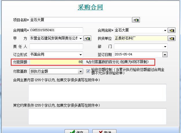 即在工程管理軟件中新建采購合同時填寫好付款限額。如下圖: