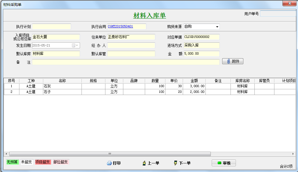 我們對該合同進行驗收,生成材料采購單,如下圖