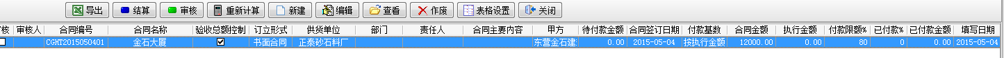 我們建立一個總價為12000的采購合同,付款基數按執行金額,付款限額為80%。如下圖
