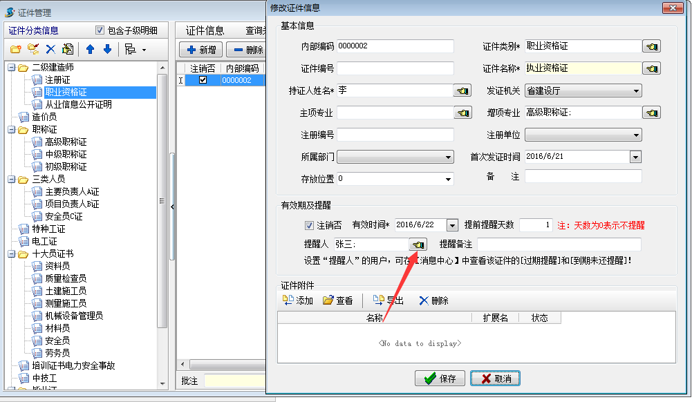 選擇一個我們已經建立好的“二級建造師”下的“職業資格證” 選擇提醒人張三和提前提醒天數、提醒備注等