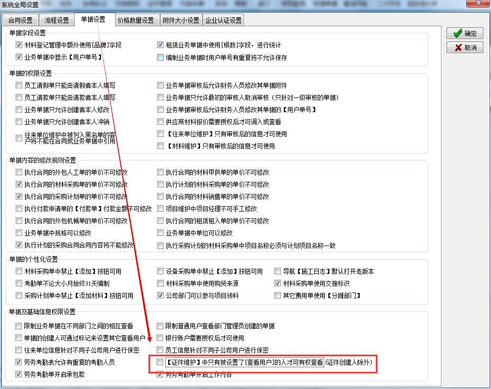 注:如果在【證件維護】中新建的證件不想設置【查看用戶】默認讓所有人看到,可以到【系統維護】->【系統全局設置】->【單據設置】中,把如下圖的開關去掉!