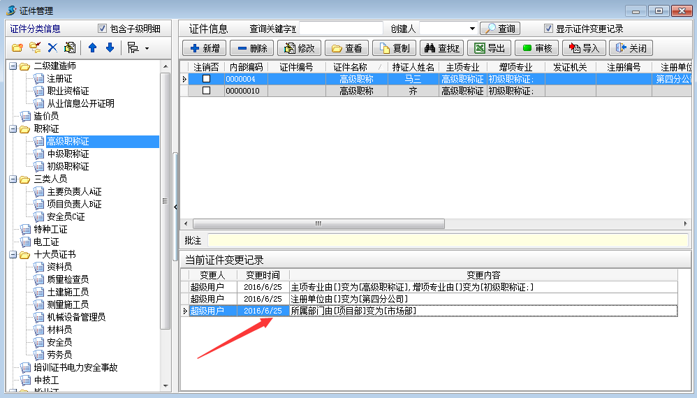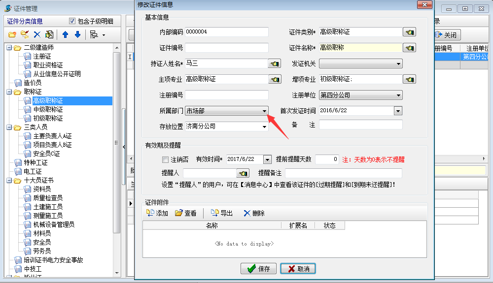 如下圖所示:證件管理的所屬部門已經由[項目部]變更為我們剛剛修改的[市場部]了