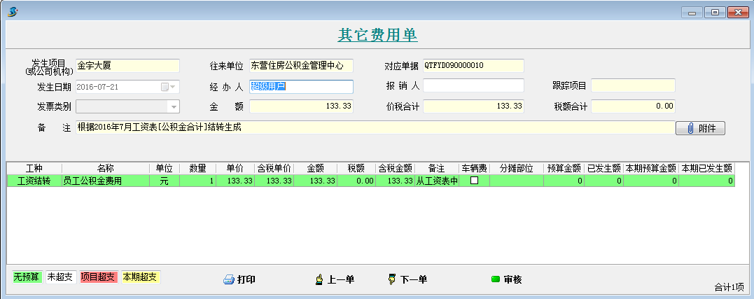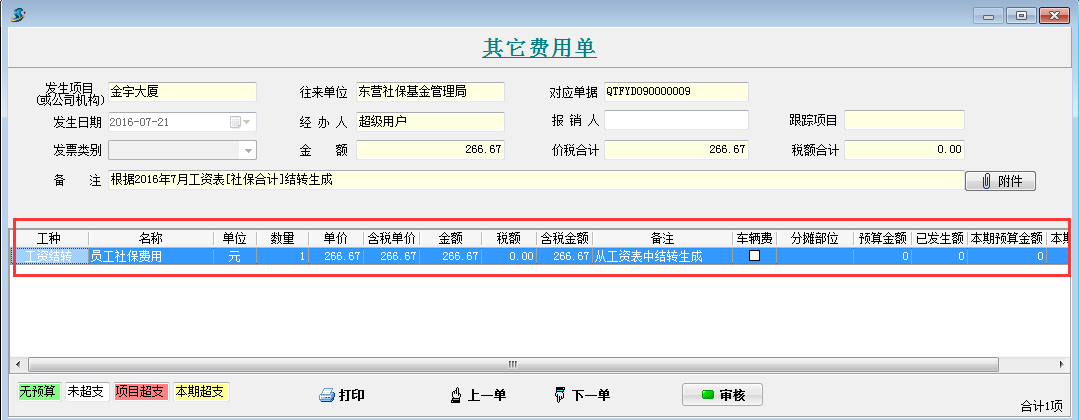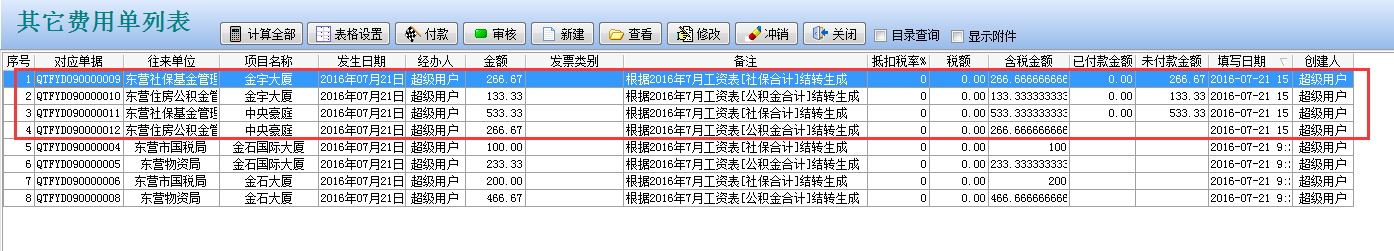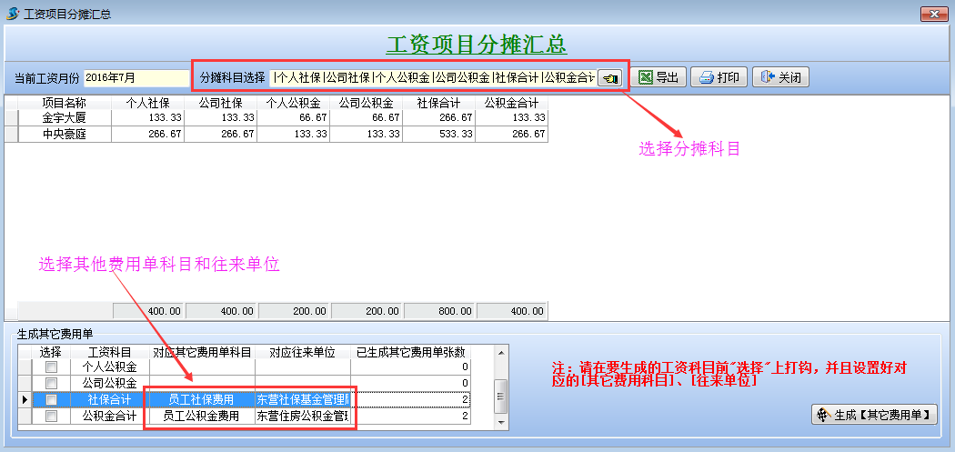 打開待攤費用模塊,選擇好分攤科目,列表中就會顯示出每個項目分攤客戶的明細。同時在這個模塊可以直接生成其它費用單,選擇好社保合計和公積金合計的對應其它費用單科目和對應往來單位,點擊生成工程項目管理系統【其它費用單】,直接可以生成四張其他費用單。