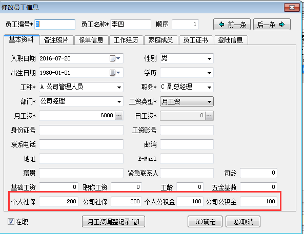 1. 首先在工程項目管理系統員工維護填寫好個人社保,公司社保,個人公積金,公司公積金相應的金額。如下圖: