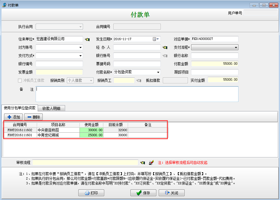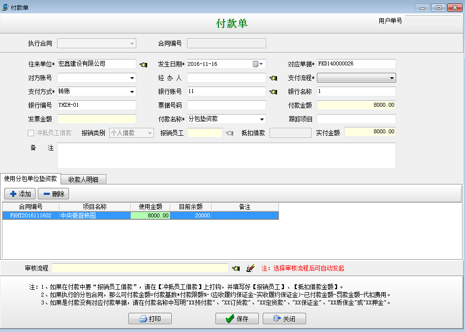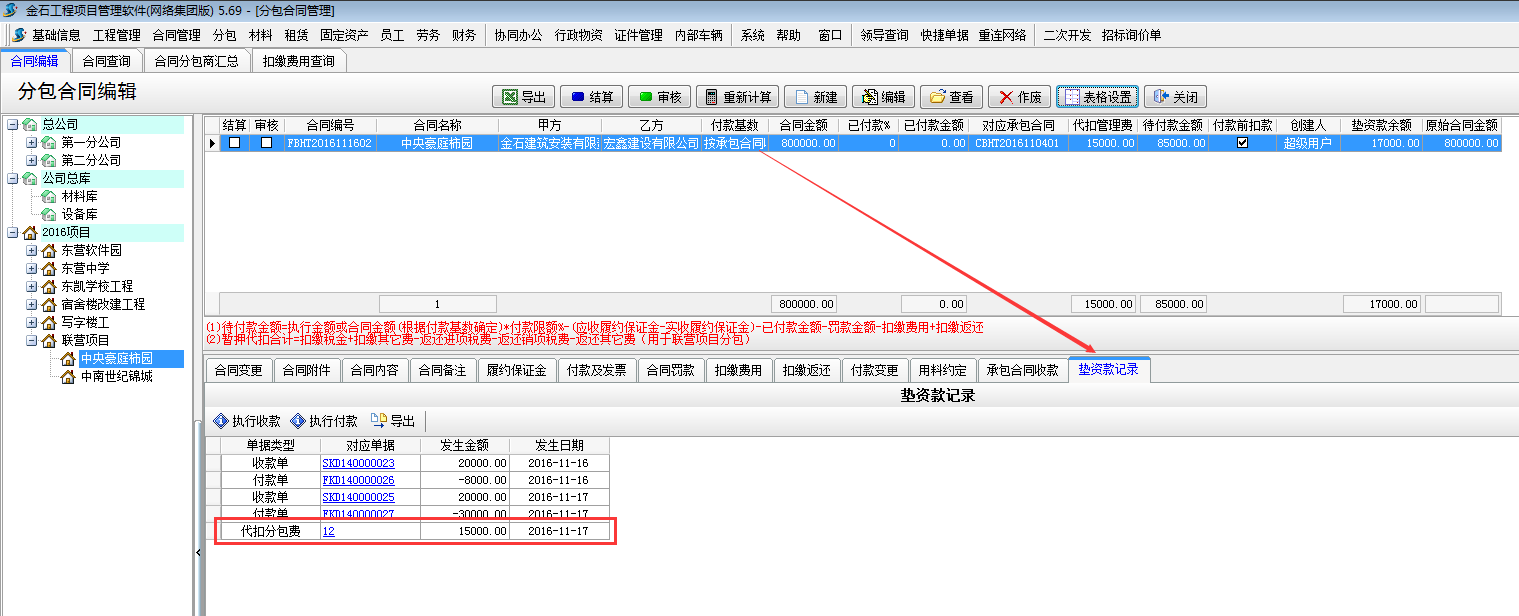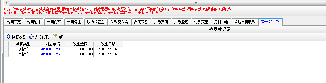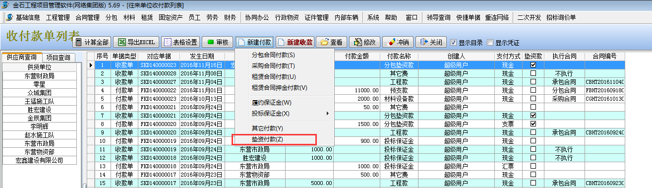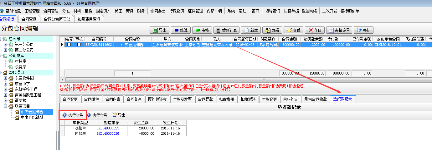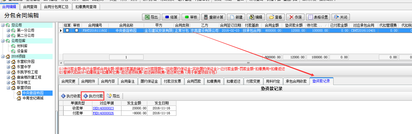 在【分包合同】-【墊資款記錄】處選擇執(zhí)行付款,或者在【財(cái)務(wù)管理】-【付款單收款單】新建付款單選擇墊資款付款。