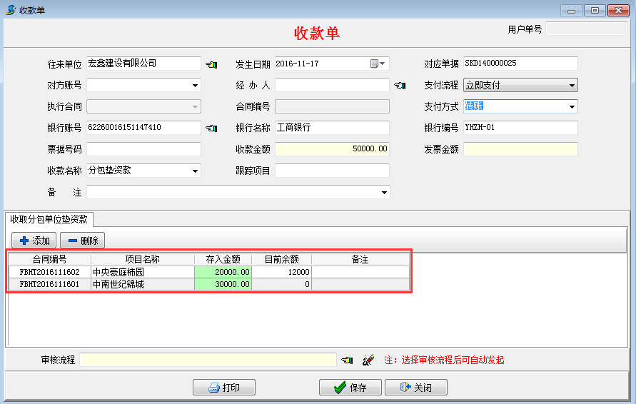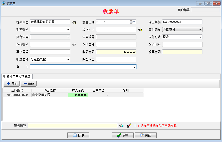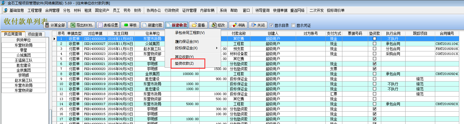 在工程項(xiàng)目管理軟件【分包合同】-【墊支款記錄】處選擇執(zhí)行收款,或者在【財(cái)務(wù)管理】-【付款單收款單】新建收款單選擇墊資款收款。