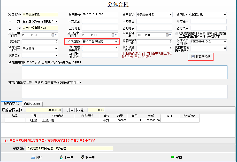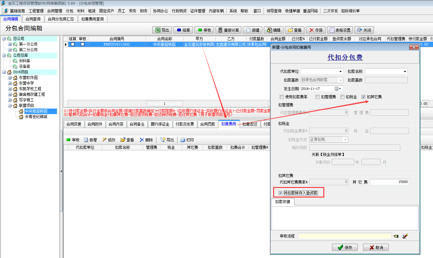 在建立分包合同時(shí)可選擇在“付款前扣款”處打鉤,這樣在付款前,必須做扣繳費(fèi)用才能付款,避免有忘記扣款的情況。具體參見文章“分包合同付款前扣款的使用”