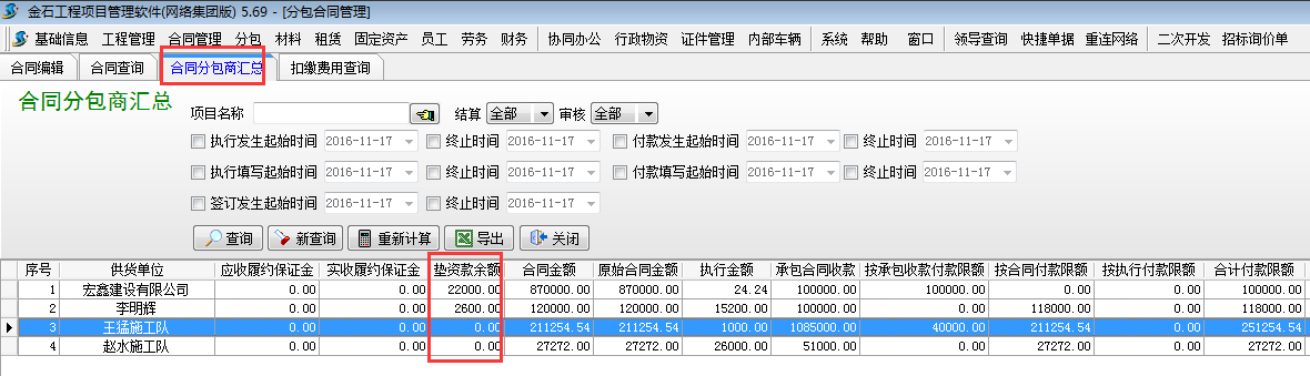 3.2 按合同查詢各合同墊資款余額。可以在【分包合同】-【合同查詢】處查詢。