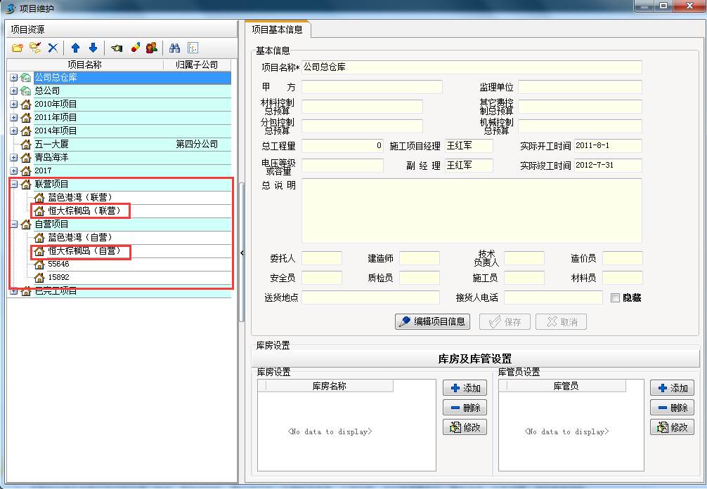 注:首先在項目維護中維護兩個大類(自營項目和聯營項目),兩個大類分別建立項目,其中在“自營項目”中記錄驗收(為了統計掛靠單位成本)和對應發票(為了統計發票歸屬分類),“聯營項目”中只做【財務管理】收付款不做相關的成本業務單據(如下圖)。