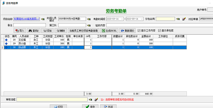1、項目部以【勞務(wù)考勤單】為勞務(wù)進出場的日報,需每日完成。月底根據(jù)【勞務(wù)考勤單】生成月度工資表進行結(jié)算