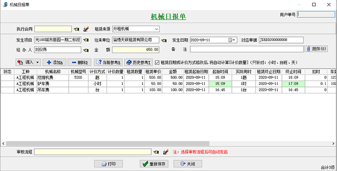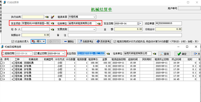 【機械結(jié)算單】需先設(shè)置發(fā)生的項目和往來單位,根據(jù)下圖所示:點擊圖中“調(diào)入”按鍵,選擇起始日期和截止日期(截止日期默認是錄單日期),選中下方涉及的租賃明細生成一張完整的【機械結(jié)算單】。