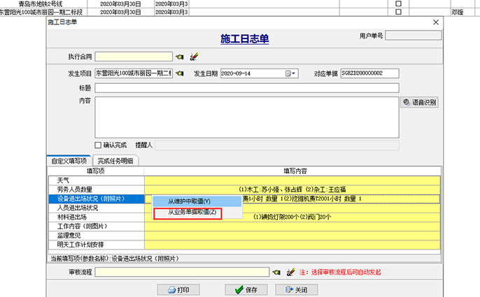 項目部人員選擇項目之后,右鍵點擊下圖中黃色區(qū)域,選擇彈出框中的“從業(yè)務(wù)單據(jù)取值”,系統(tǒng)會根據(jù)當前發(fā)生日期所填報的【勞務(wù)考勤單】、【材料驗收單】、【機械日報單】自動生成當天的施工日志。