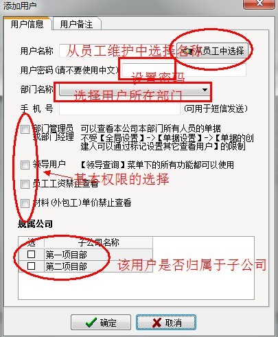 點(diǎn)擊添加用戶,在彈出的窗口中,依次添加好用戶信息,主要包含用戶名、密碼、所屬部門、所屬公司等。