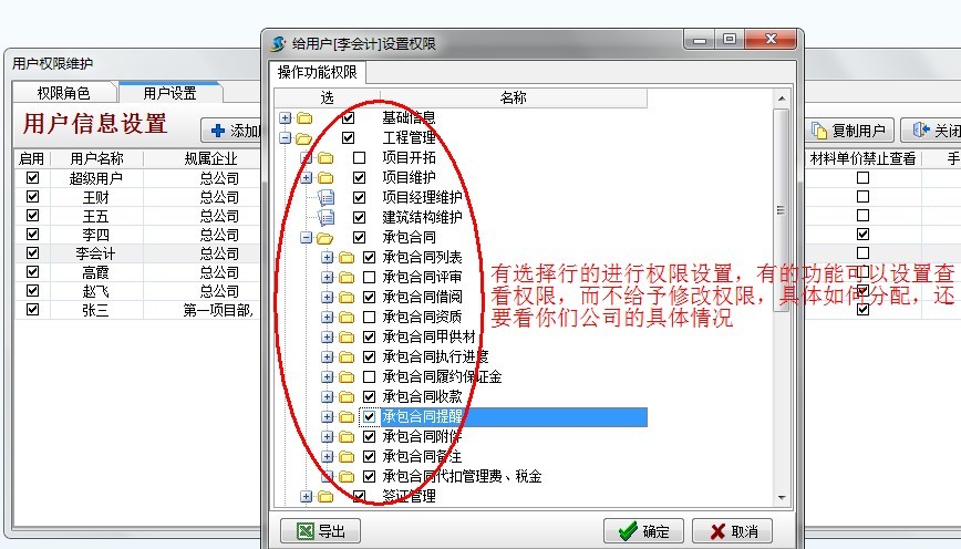 點(diǎn)擊【用戶管理權(quán)限設(shè)置】在彈出的窗口中來設(shè)置用戶操作權(quán)限。