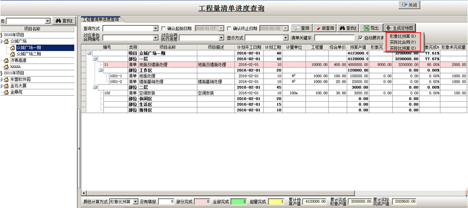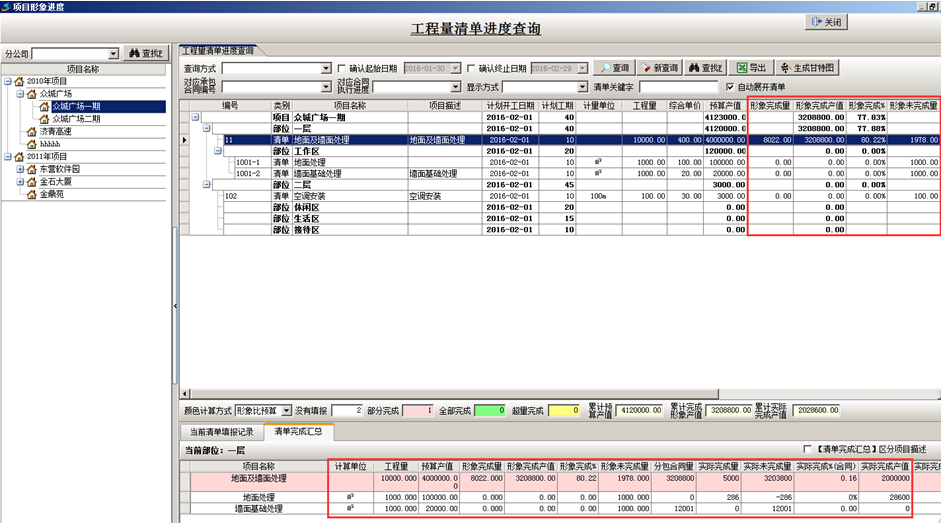 項目進度查詢時,系統會根據項目部分以及工程量清單匯總項目進度。如圖: