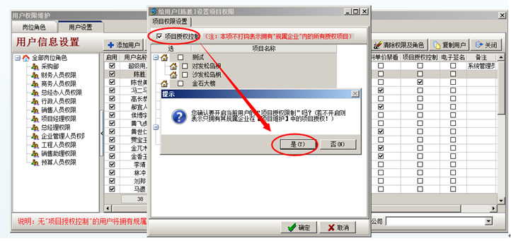 彈出設(shè)置項目授權(quán),以陳勝只有金石大樓這個項目的權(quán)限進行項目授權(quán)