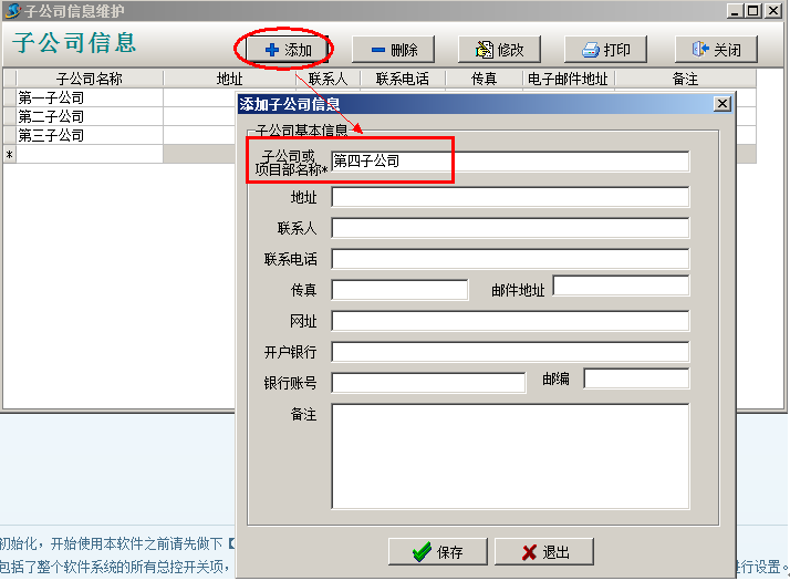 金石工程管理軟件中首先維護子公司名稱,打開菜單欄----系統(tǒng)----子公司信息維護