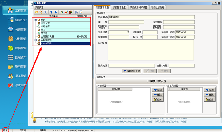 工程管理軟件中設(shè)置完成之后,重新登錄陳勝的賬戶,查看該員工的項目權(quán)限,項目維護中顯示的項目只有金石大樓這個項目