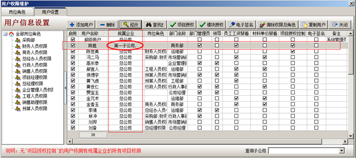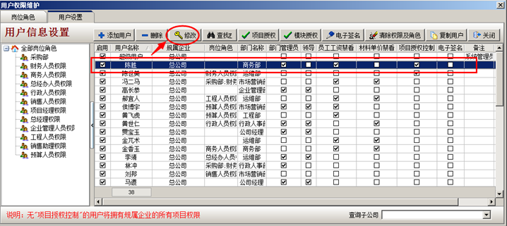 3.工程管理軟件中設(shè)置子公司員工:以員工陳勝為例講解,登錄超級用戶----系統(tǒng)維護----用戶管理權(quán)限設(shè)置。選中員工陳勝,點修改按鈕