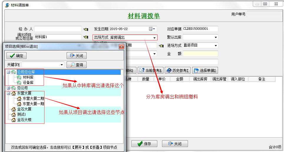 【材料調撥單】是當施工企業在工地現場材料管理中承接多項工程時,可能會需要把為某一工程購買的材料調撥給另一工程使用,將本公司的材料中轉庫的材料發到項目上,此時應填寫【材料調撥】單。錄入本單據前, 需先錄入要用到基礎信息中的【材料維護】、【項目維護】(包括【庫房信息】、【領料班組信息】)。該單據影響工地現場材料管理中基礎信息中的【工程成本】、【工程材料成本對比】、【工地材料用量查詢】、【工地材料庫存查詢】、【項目材料總量、單平方用量對比表】、【材料庫存(項目用量)、采購量匯總表】以及預算里的【材料對比表】、【材料超支查詢】、【項目材料超用、節余對比表】。