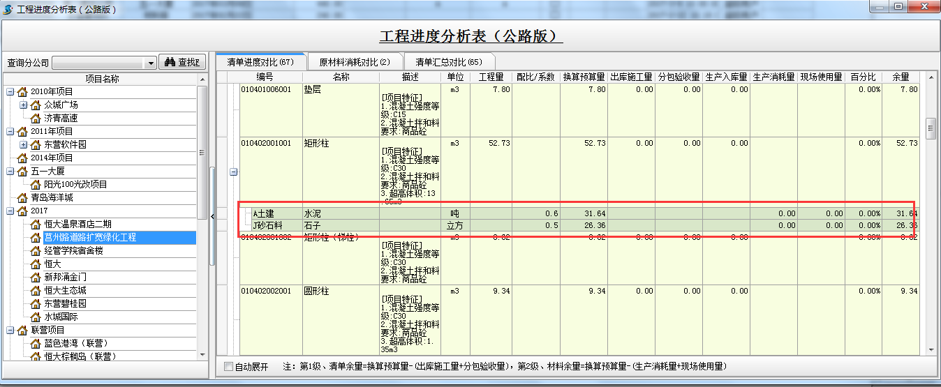 【編號(hào)、名稱、描述、單位、工程量、配比/系數(shù)】是根據(jù)軟件中部位分解及工程量清單設(shè)置得來的;【換算預(yù)算量】是根據(jù)工程量*配比/系數(shù);【出庫施工量】是根據(jù)做的材料出庫單或者材料調(diào)撥單出庫清單成本材料;【分包驗(yàn)收量】是根據(jù)做的外包人工單計(jì)算得來的; 【生產(chǎn)入庫量】是根據(jù)做的材料加工單成品材料得來;【生產(chǎn)消耗量】是根據(jù)是根據(jù)做的材料加工單原材料得來;【現(xiàn)場(chǎng)使用量】是根據(jù)做的材料出庫單或者材料調(diào)撥單出庫原材料;【百分比】是根據(jù)出庫施工量/換算預(yù)算量;【余量】:第一級(jí)清單余量=換算預(yù)算量-(出庫施工量+分包驗(yàn)收量),第二級(jí)、材料余量=換算預(yù)算量-(生產(chǎn)消耗量+現(xiàn)場(chǎng)使用量)。