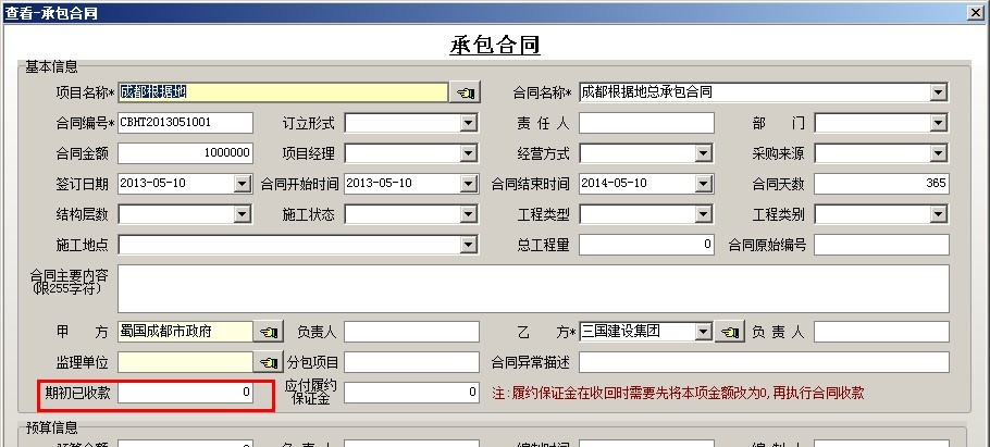 在建工程的期初已收工程款(在使用軟件之前,已經收到的工程款),要在承包合同中錄入。如下圖: