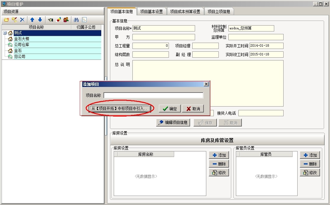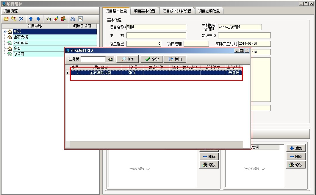 以公司的“市場部”或“銷售部”來進行前期費用的承擔。如果項目沒有中標,則前期跟蹤費用自然歸屬到該部門下,如果中標通過在【項目維護】中新建項目,從項目開拓中引入,并確認結轉費用即可。