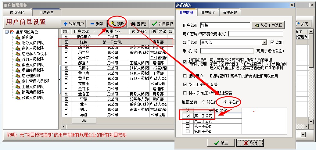 將陳勝設置為一分公司登錄超級用戶,導航欄---系統(tǒng)維護---用戶管理權限設置,打開權限維護窗口,選中陳勝,點修改,在彈出的密碼修改窗口,選擇歸屬公司為子公司,子公司名稱為第一子公司