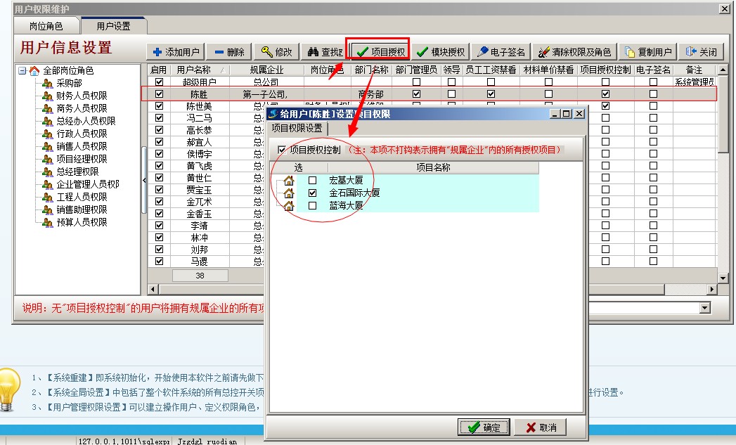 二、 項目按個人授權 (注:適合普通企業(yè) 或 集團公司下的分公司) 1、 以剛才陳勝為例,只讓他看到金石國際大廈 項目 (配合上面的項目按分公司授權,這樣就可以實現集團公司的項目二級授權)具體操作:登錄超級用戶---系統(tǒng)維護---打開用戶管理權限設置,選擇員工陳勝,點項目授權,開啟項目授權控制,在金石國際大廈這個項目前面打鉤