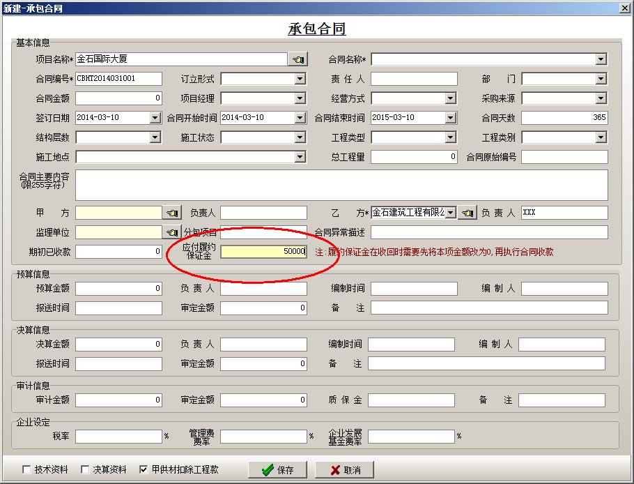 左邊選中新建的項(xiàng)目名稱金石國(guó)際大廈,右邊點(diǎn)擊新建,彈出新建承包合同窗口,錄入合同基本信息,填寫(xiě)合同履約保證金金額,然后保存。